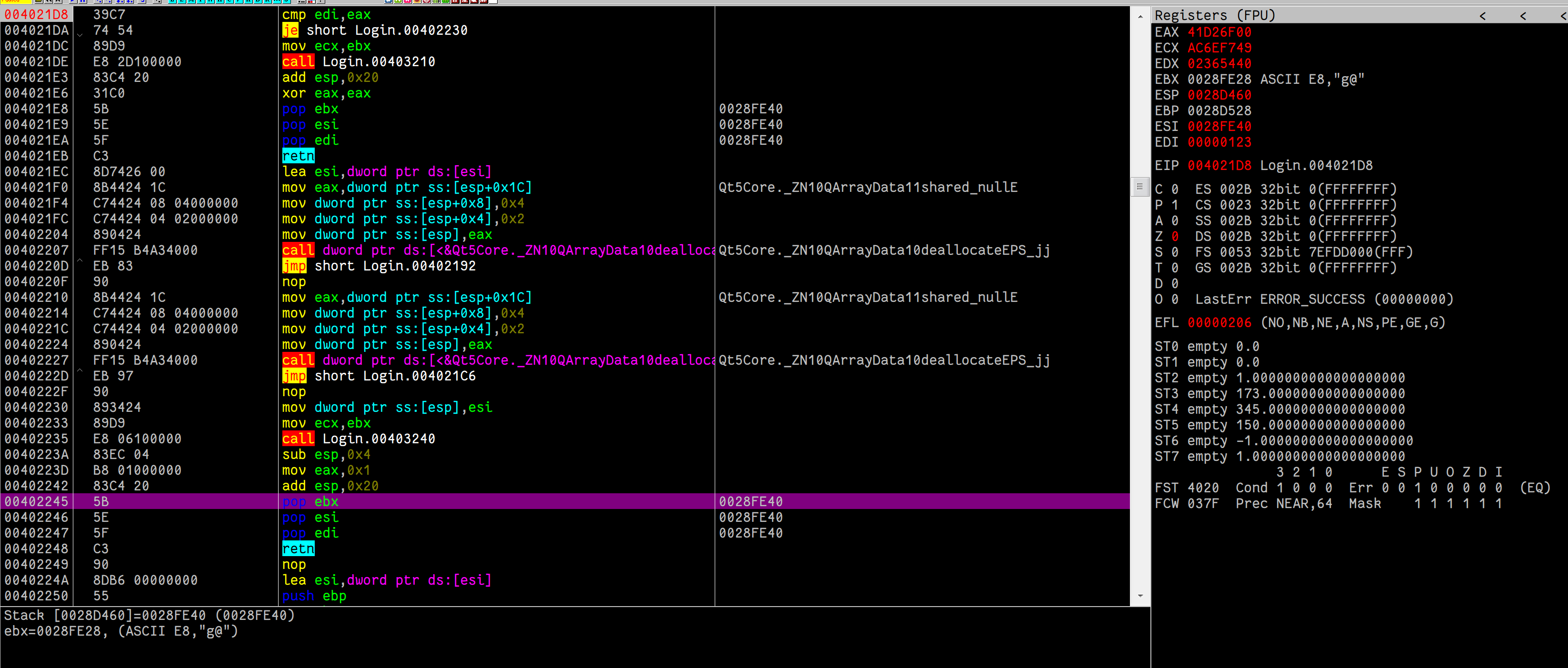 flag='' point=0 for i in range(38): s=Solver() var=[BitVec('zzz',8) ,0,0] tmp=var[0] while 1: op1=opcode[point] if op1==0x34 and opcode[point+1]==0: print ("0x34 0") s.add(var[0] >= ord(' ')) s.add(var[0]<= ord('~')) point+=4 continue if op1==0x34 and opcode[point+1]!=0: print ("0x34 1" ) var[opcode[point+1]]=opcode[point+2] point+=4 continue if op1==0x3b: print ("0x3b" ) if opcode[point+1]!=0 and opcode[point+2]!=0: var[opcode[point+1]]+=var[opcode[point+2]] else: var[0]+=var[opcode[point+2]] point+=4 continue if op1==0x6e: print ("0x6e") if opcode[point+1]!=0 and opcode[point+2]!=0: var[opcode[point+1]]^=var[opcode[point+2]] else: var[0]^=var[opcode[point+2]] point+=4 continue if op1==0x3d: print ("0x3d") if opcode[point+1]!=0 and opcode[point+2]!=0: var[opcode[point+1]]-=var[opcode[point+2]] else: var[0]-=var[opcode[point+2]] point+=4 continue if op1==0x3a: print ("0x3a" ) if opcode[point+1]!=0 and opcode[point+2]!=0: var[opcode[point+1]]*=var[opcode[point+2]] else: var[0]*=var[opcode[point+2]] point+=4 continue if op1==0x4f: print ("0x4f") s.add(var[0]==0) print (s) print (s.check()) result = s.model() flag += chr(result[tmp].as_long().real) point+=4 break raw_input()
